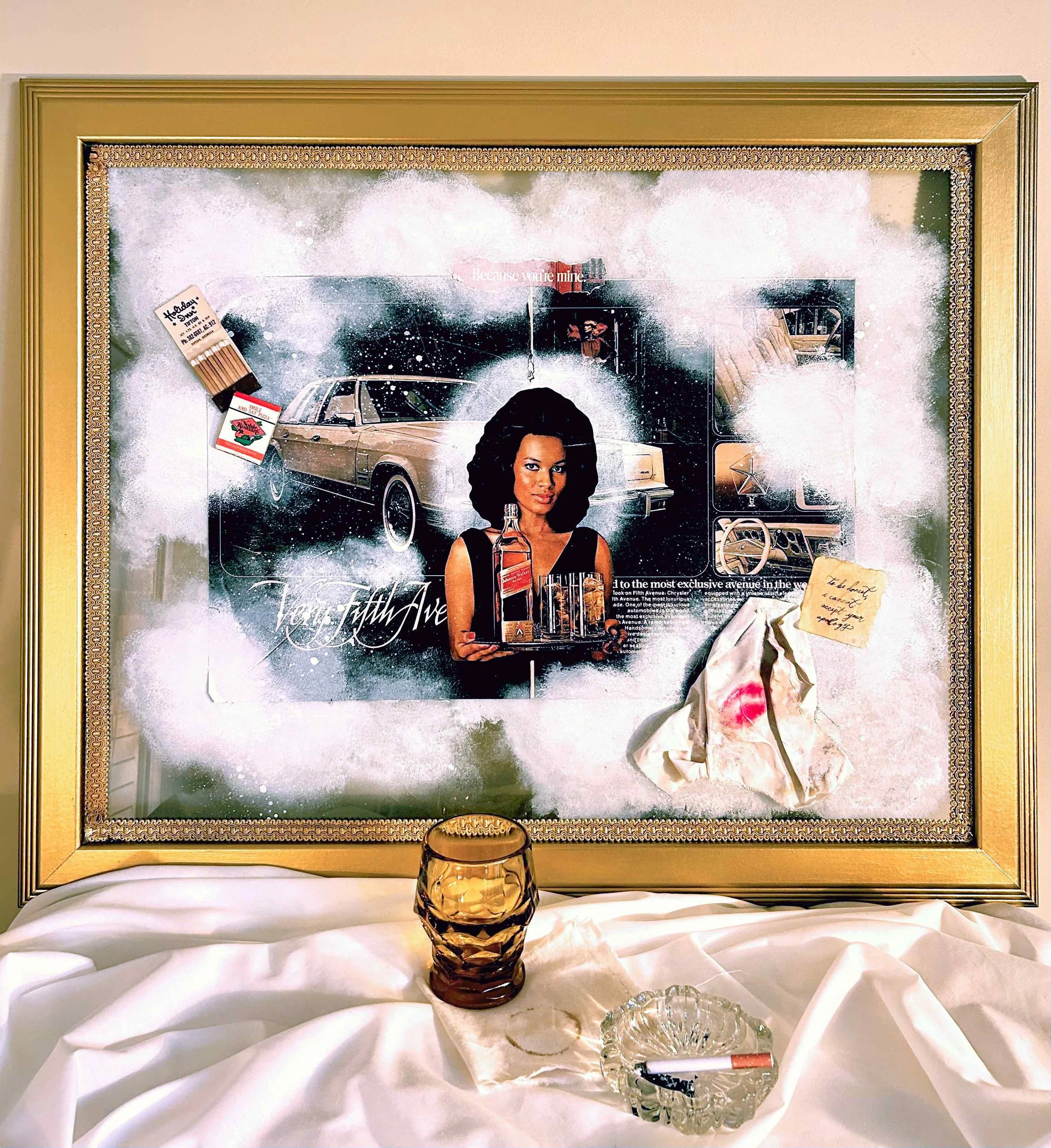 Collage & installation— glass with upcycled frame, vintage magazine photos, gesso, fabric, vintage matchbooks, vintage drinking glass, vintage ashtray